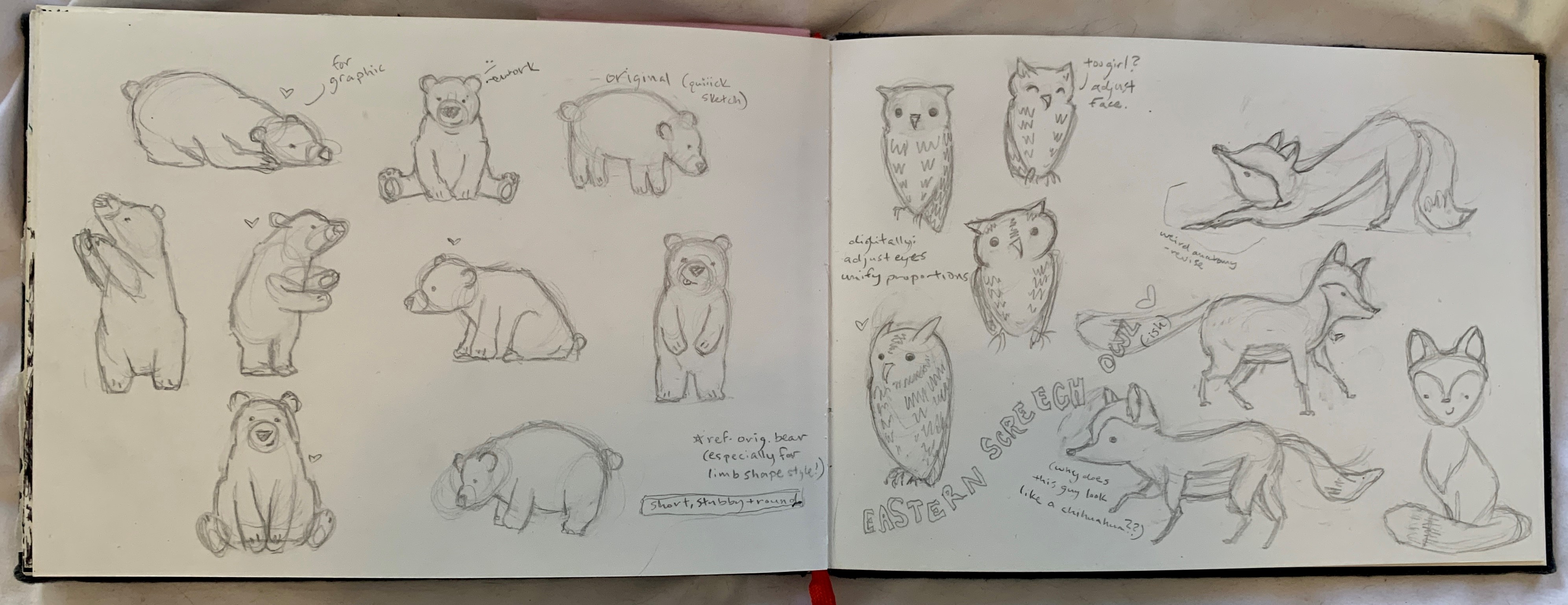 Beginning with 5 min. timed sketches, I tested a variety of characters and poses. Sketchbook pages were scanned, imported to Illustrator, and vectorized. From there, characters and elements were arranged into repeat patterns and graphics in Illustrator and Photoshop.